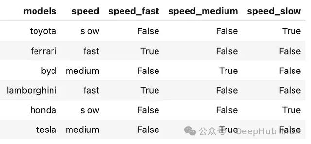 data = pd.DataFrame({‘models’:[‘toyota’,‘ferrari’,‘byd’,‘lamborghini’,‘honda’,‘tesla’], ‘speed’:[‘slow’,‘fast’,‘medium’,‘fast’,‘slow’,‘medium’]}) data = pd.concat([data, pd.get_dummies(data[‘speed’], prefix=‘speed’)],axis=1) data