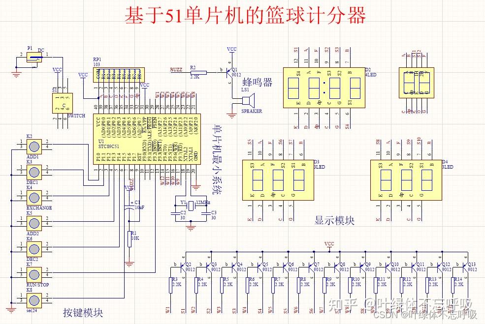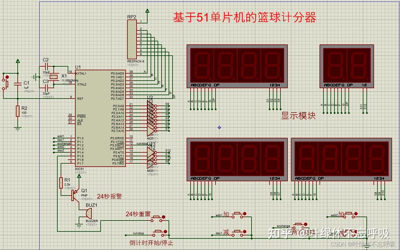 (5)有24秒倒计时功能,可通过按键随时复位24秒,如果24秒违例会启动蜂鸣器报警,同时比赛时间暂停,处理好后按一下24秒复位键,比赛继续。