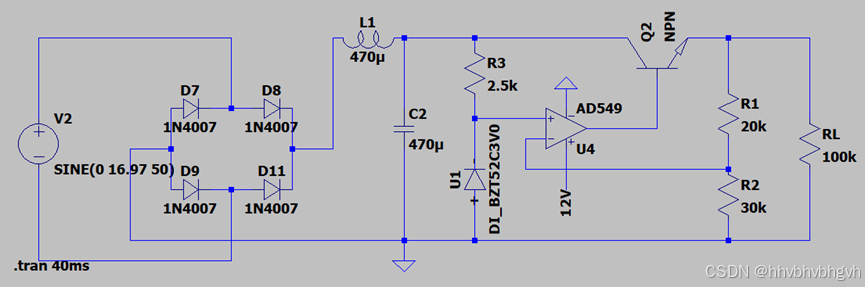 <p> 现有12V,50Hz的交流电源,需要将其转为5V的直流电输出。 基本的思想是先接入桥式电路整流滤波,然后进行降压稳压。 电路原理图如下:</p>