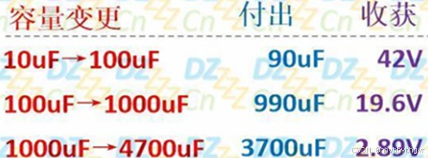 如桥式整流滤波,滤波电容的容量从10uF到100uF,纹波电压改善是64V-22V=42V,从100uF到1000uF的纹波改善值为22V-4.24V=19.6V,而从1000uF到4700uF的纹波改善值就只有4.24-1.35=2.89V了,如下图所示: