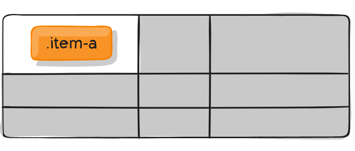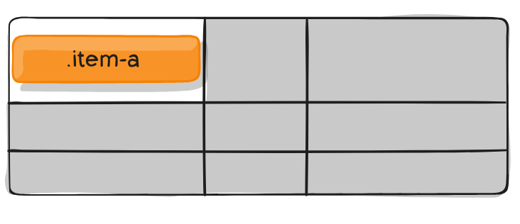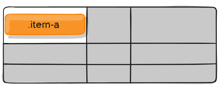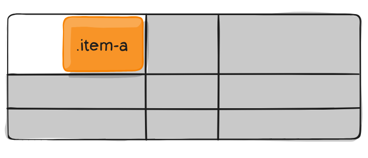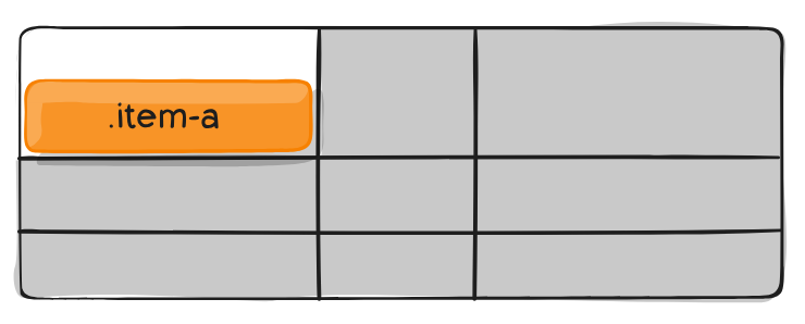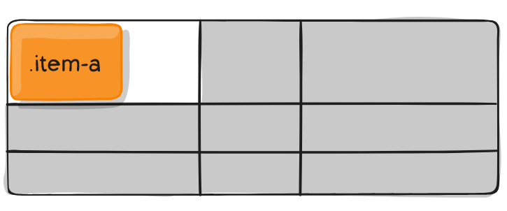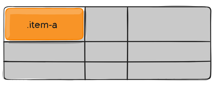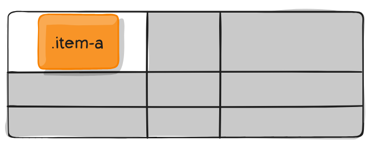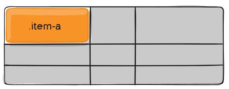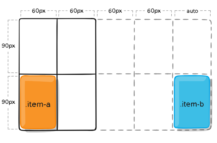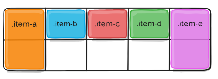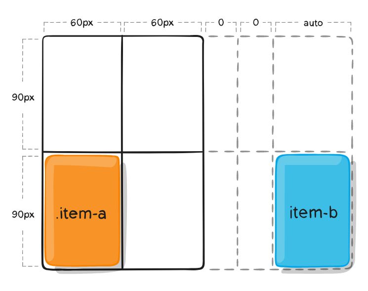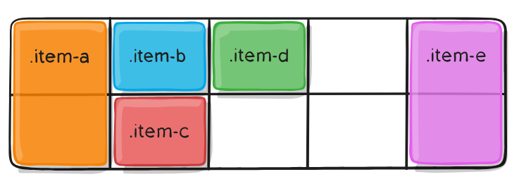 因为我们把 grid-auto-flow 设成了 row ,所以我们的网格看起来会是这样。注意 我们没有进行定位的网格项(item-b,item-c,item-d)会这样排列在可用的行中: