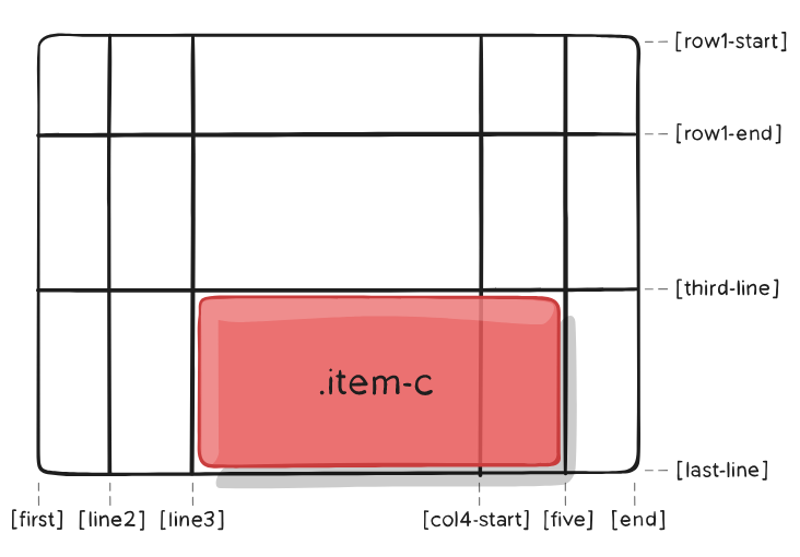 通过引用特定网格线(grid lines) 来确定 网格项(grid item) 在网格内的位置。 grid-column-start / grid-row-start 是网格项开始的网格线,grid-column-end / grid-row-end 是网格项结束的网格线。