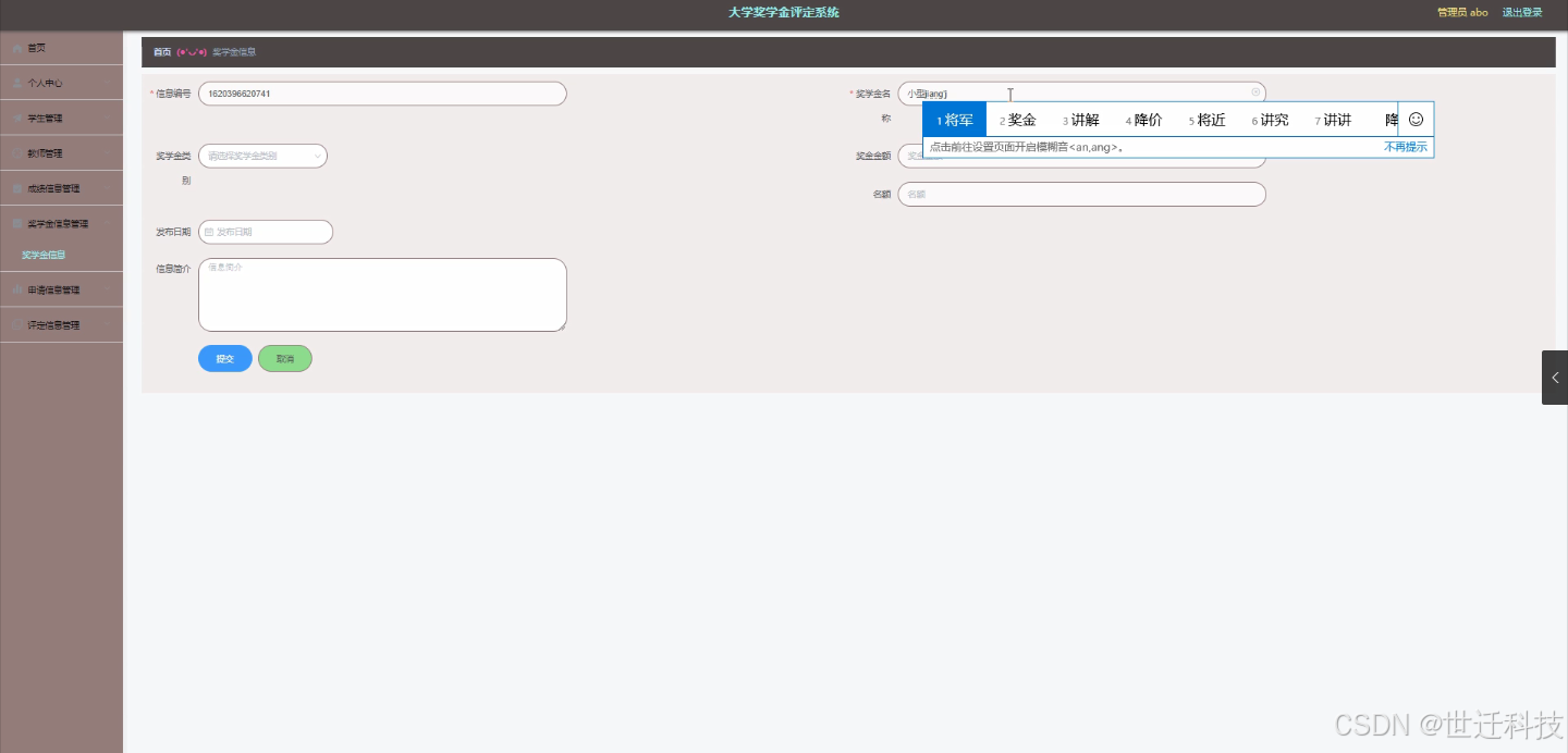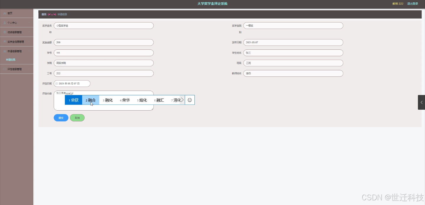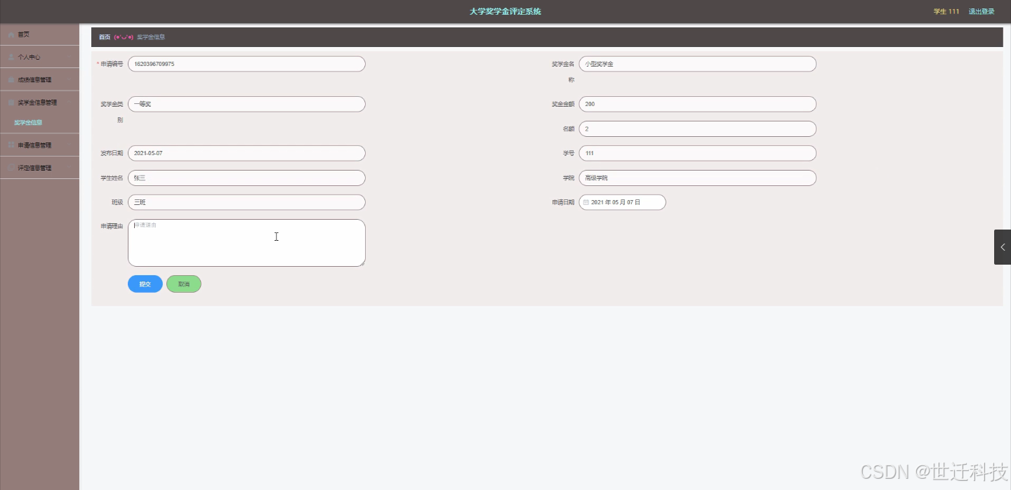 - 为学生提供奖学金申请的入口,学生可以在系统中填写个人的申请信息,如申请奖项、个人事迹简述等内容。