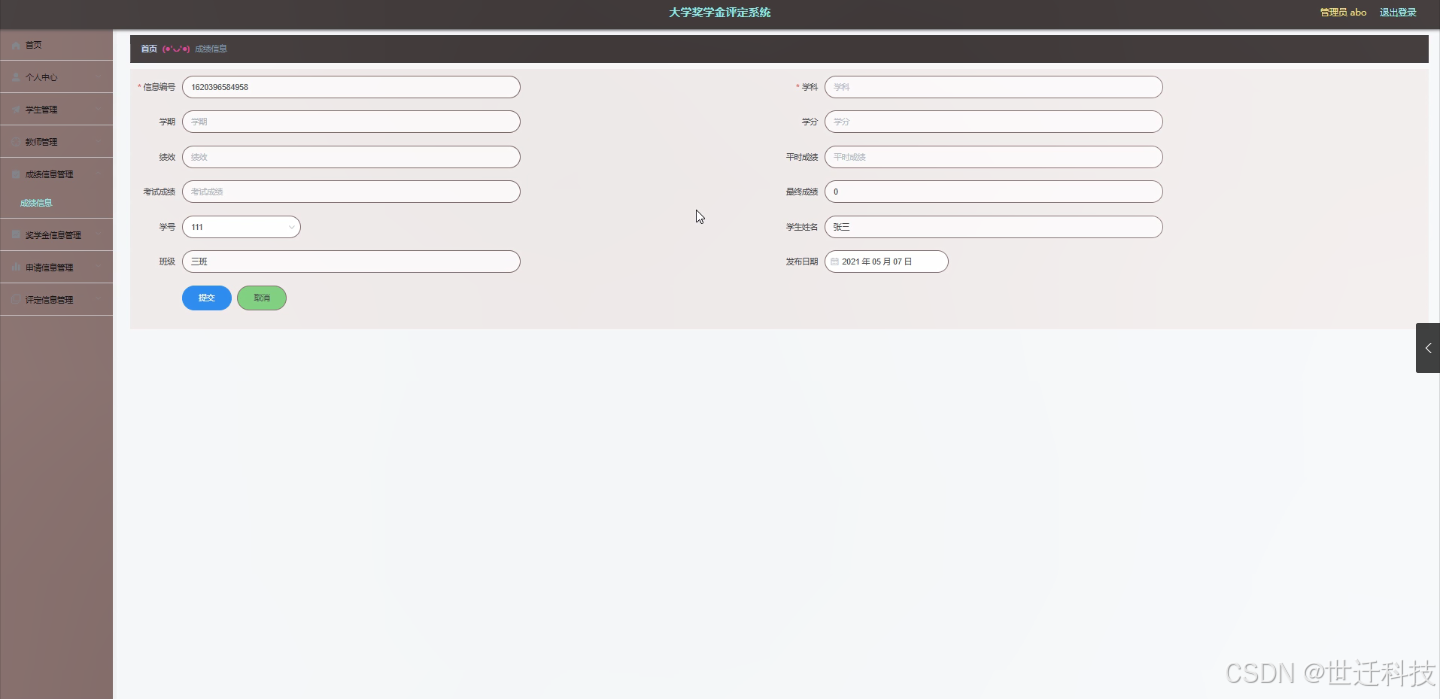 - 开发出一套完整的大学奖学金评定系统,该系统具备学生、教师、成绩信息、奖学金信息、申请信息、评定信息、学院信息、专业信息、班级信息、学科信息等管理功能,能够高效、准确地进行奖学金评定工作。