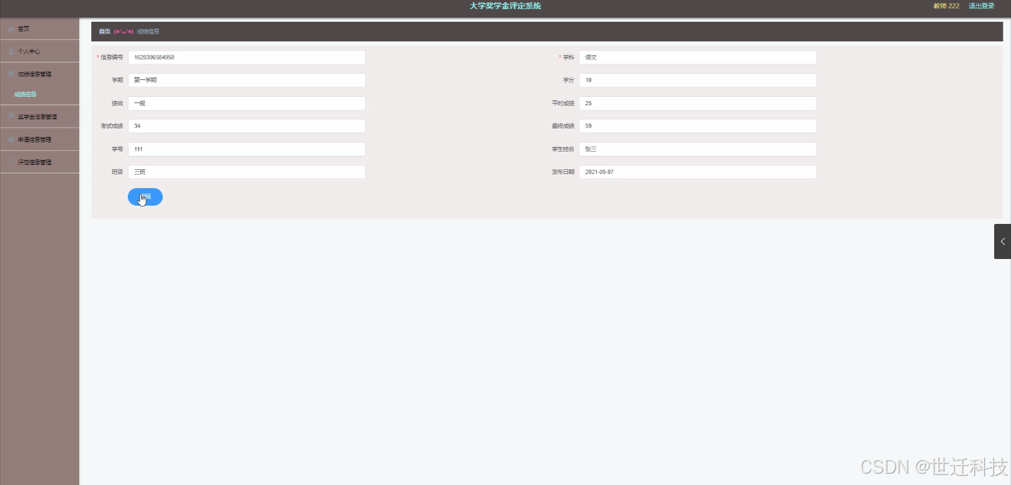 - 教师能够根据系统设定的评定标准,对学生的奖学金申请进行评定。这包括查看学生的成绩、申请信息、个人事迹等内容,并给出评定分数或者评定意见。