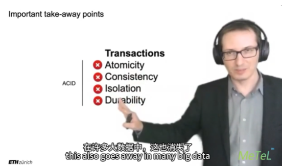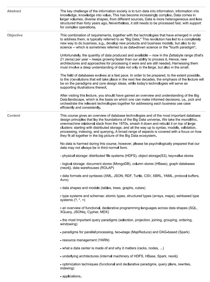 以上截图选自苏黎世联邦理工学院 Big Data(《大数据》)课程。本课程概述了数据库技术,以及奠定大数据世界基础的最重要数据库设计原则。课程将从20世纪70年代的单一机器关系堆栈开始,将其打破并在大型集群之上重新构建:从分布式存储开始,一直到语法、模型、验证、处理、索引和查询。本课程涵盖了广泛的内容,并重点介绍了它们如何在大数据生态系统中作为一个整体协同工作。