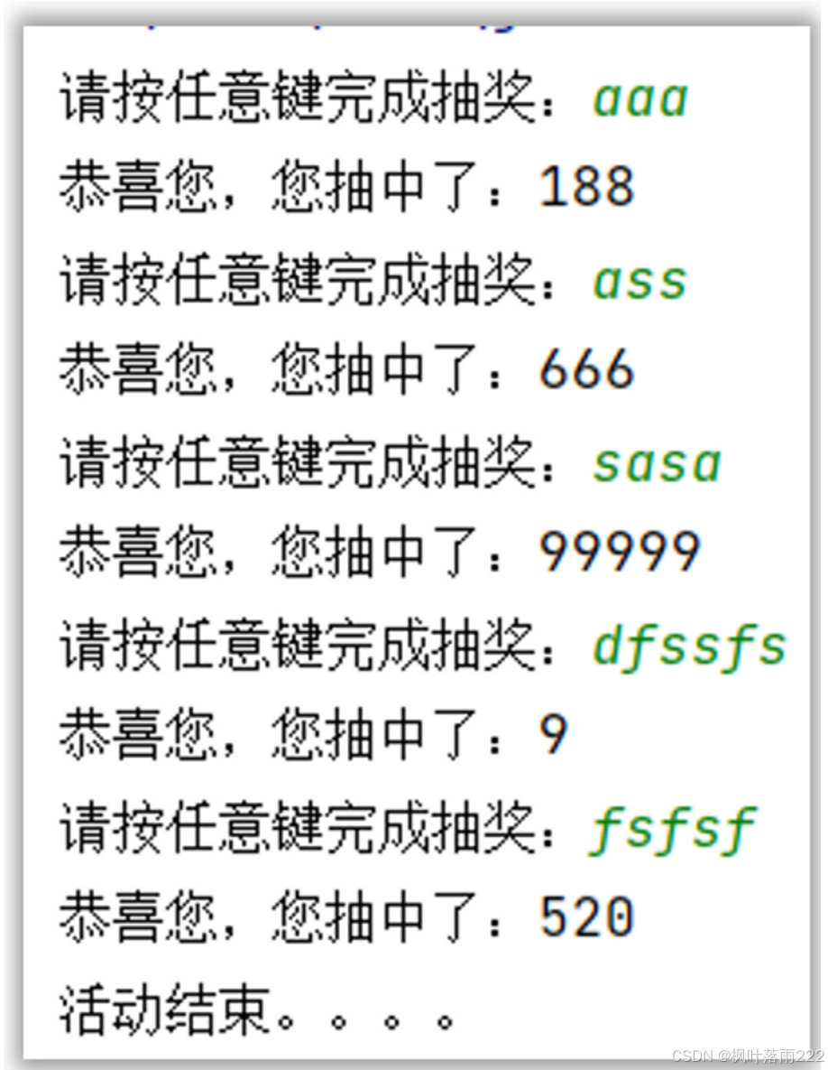 2)每次循环,键盘录入,提示"用户录入任意键抽奖:"
