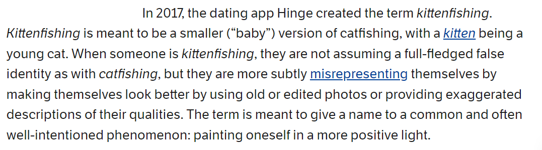 这篇推文的目的是英语教学,我就不展开道德层面的讨论了。 有兴趣的朋友可以自己想想: 你眼中 kittenfishing的边界在哪里? 你有没有在交友软件上发过美化自己相貌或与现阶段年龄不符的照片? 你又有没有像填写简历一样夸大自己的成就?