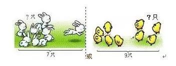 (3)这类问题有大括号和小问号提示你,问题问的是什么(有时问的是左边部分有多少,有时问的是右边部分有多少),所以先要找到总数是多少,然后去掉没有小问号的一边,就知道了。但是学生的描述也很重要,不少学生会看图,但是不会说题目的意思,家长要让孩子在家多说,例如”一共有7只小兔在吃草,走了1只,还剩几只小兔?”或”一共有9只小鸡在吃食,现在只有5只在吃食,走了几只小鸡?”。后一种是逆向思维,学生较难表述。