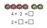 (2)这类问题因为有大括号和小问号的提示,明确了问题是什么,所以通常是根据问题问的是什么选择合适的方法列出算式就可以了,所以只写一道。当小问号在大括号的小尖尖处的时候,通常求左右两部分合起来一共有多少。要求学生可以这样描述:有4只小兔,又来了2只小兔,一共有几只小兔?(算式只写一个,可以是4+2=6,也可以是2+4=6)