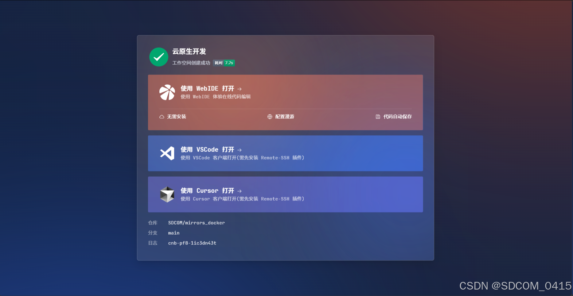 而在云原生构建 CNB 中,你只需要在仓库的分支选择页面,点击右上角的云原生开发按钮,就会开始创建一个默认的开发环境
