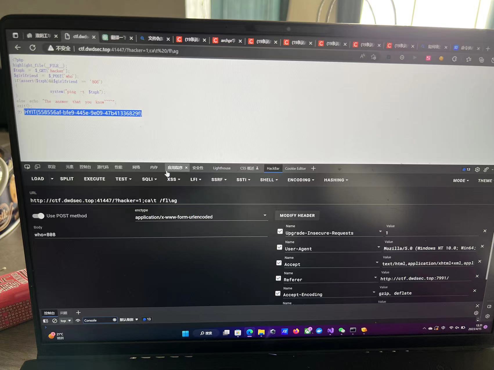2发现有一个注入框并且提示xss所以是xss,只要让他弹窗就可以了,输入<script>alert(1)</script>弹出php代码页面