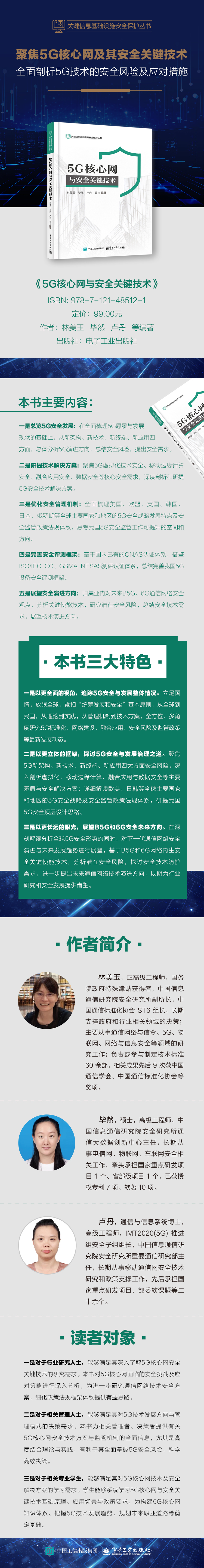 作为5G技术的研究者、政府决策的支撑者,中国信息通信研究院安全研究所5G安全技术专家合力编写《5G核心网与安全关键技术》专业著作,从5G发展历程出发,阐述其对5G安全的理解和认识,探讨了新架构、新技术、新终端、新应用下,5G安全已有布局和未来工作方向,同时归集业内对未来B5G、6G网络安全的观点,展望了移动通信安全技术的演进方向,致力于协调产业和政策有机结合,推动“5G安全网络”加快建设,为新基建和各行各业的安全发展保驾护航。