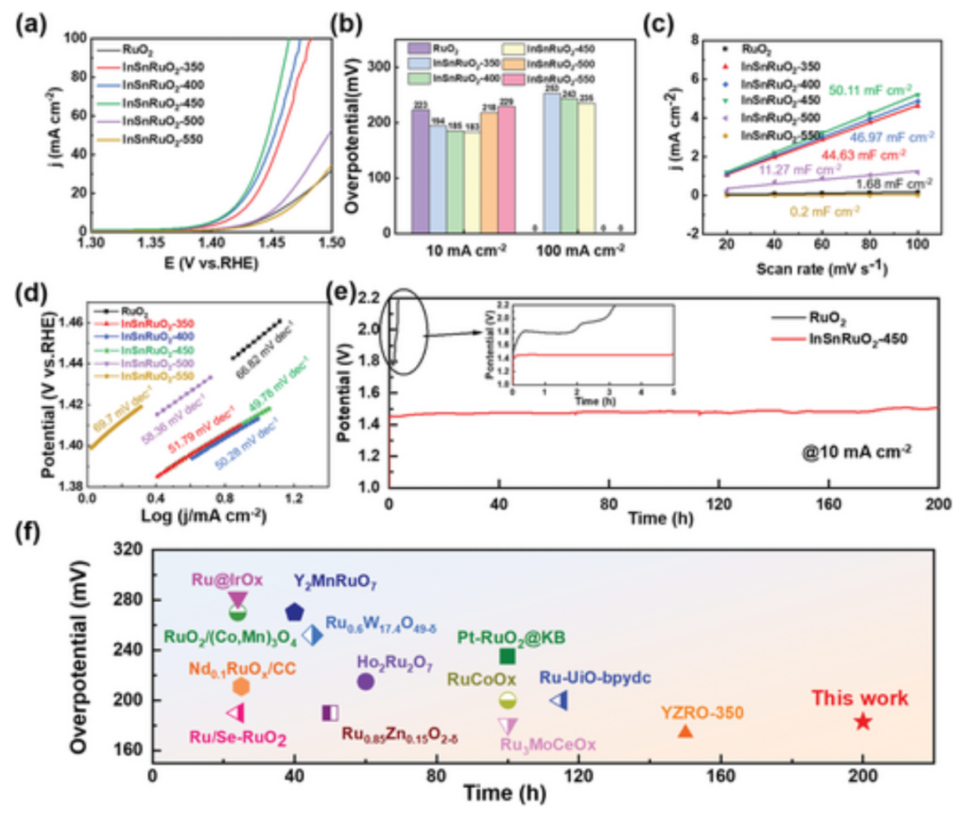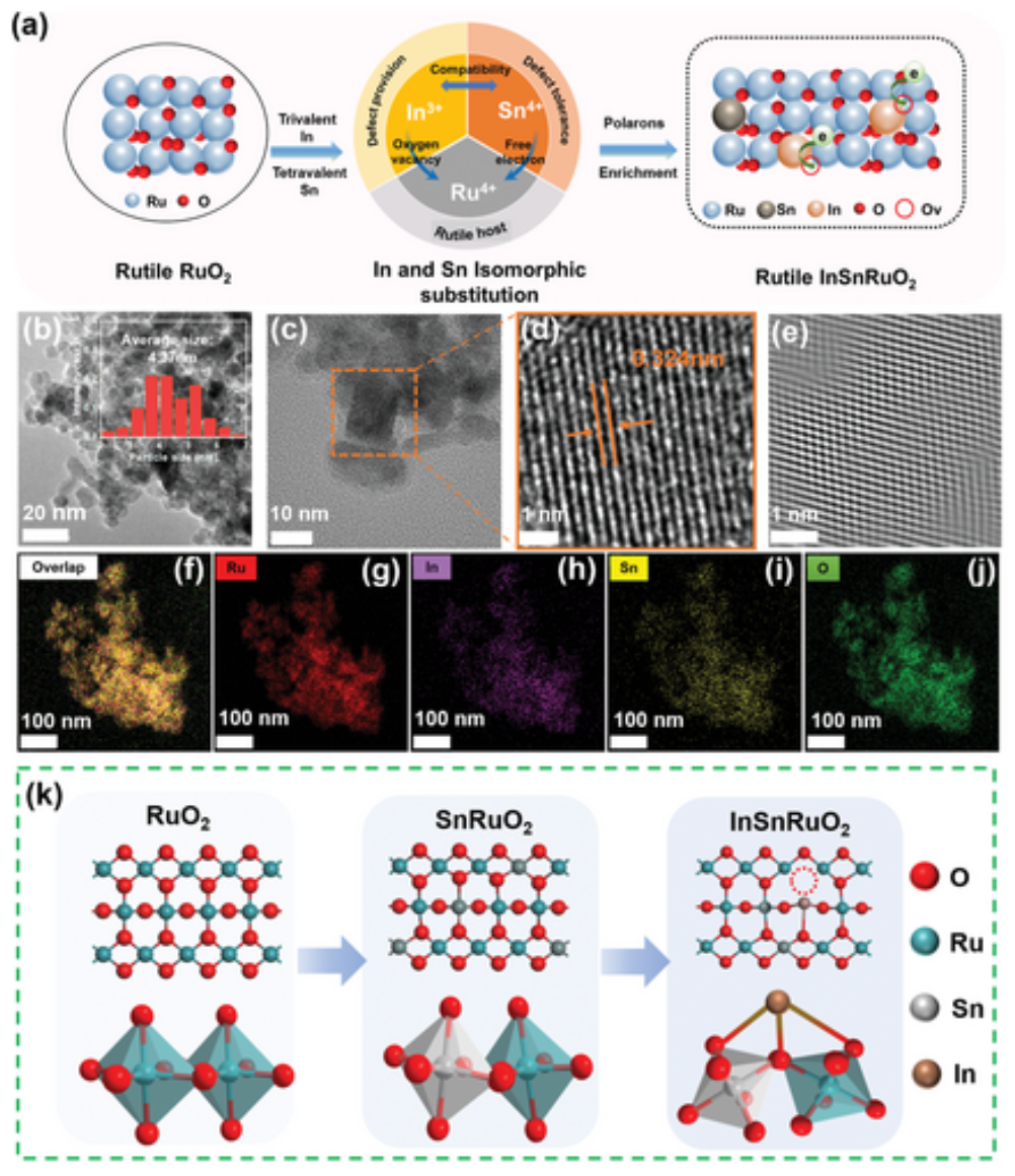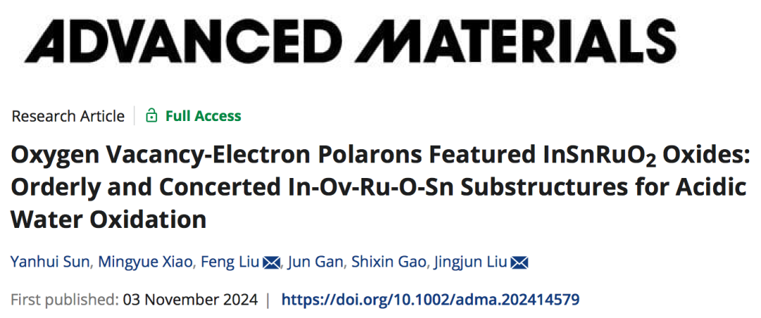 电催化讨论群-1: 多金属氧化物通过等构取代(isomorphic substitution strategy),具有独特的电子结构和几何结构,调节的电子能带,配位环境,因此能够对催化水氧化反应产生独特的贡献,这个效应对于质子交换膜电解水器件(PEMWE)非常重要。有鉴于此,北京化工大学刘景军教授、云南贵金属研究所刘锋博士等报道首次通过等构取代策略,合成了控制氧缺陷(Ov)密度的InSnRuO2,这种合成方法使用三价In产生Ov,相邻金属离子作为供电子体,因此形成有序和密集的In-Ov-Ru-O-Sn结构。本文要点要点1. 在酸性水氧化催化反应中,InSnRuO2催化剂具有超低的过电势(183 mV),质量活性达到103.02 A mgRu-1。PEMWE的长期稳定性测试结果表明,能够在比较低的电压(1.56 V)和50 mA cm-2电流密度持续工作200 h,在0.5 M H2SO4电解液中的性能超过了IrO2||Pt/C。要点2. 加速老化测试结果表明PEMWE器件使用纯水电解液没有明显电压增加,甚至是在电流密度从1 A cm-2提高至5 A cm-2。显著改善的性能与密集Ov电子极化能够稳定In-Ov-Ru-O-Sn结构,因此能够同时活化氧物种的能带,并且显著增强OER反应动力学。更加重要的一点是,自限域Ov电子极化能够导致熵和焓的降低,因此阻碍Ru原子溶解,得到长期稳定的氧化物。这项工作有助于设计下一代含有极化子的Ru催化剂以及设计结构不对称的载体活性位点用于电催化PEMWE。 Yanhui Sun, Mingyue Xiao, Feng Liu, Jun Gan, Shixin Gao, Jingjun Liu, Oxygen Vacancy-Electron Polarons Featured InSnRuO2 Oxides: Orderly and Concerted In-Ov-Ru-O-Sn Substructures for Acidic Water Oxidation, Adv. Mater. 2024DOI: 10.1002/adma.https://onlinelibrary.wiley.com/doi/10.1002/adma.电催化讨论群-1: /o:p光催化群-2: /o:p均相催化与酶催化群-2: /o:p纳米催化群-1: /o:p多孔材料群-2: 理论计算群-2: