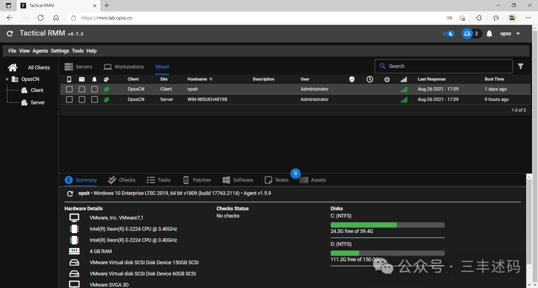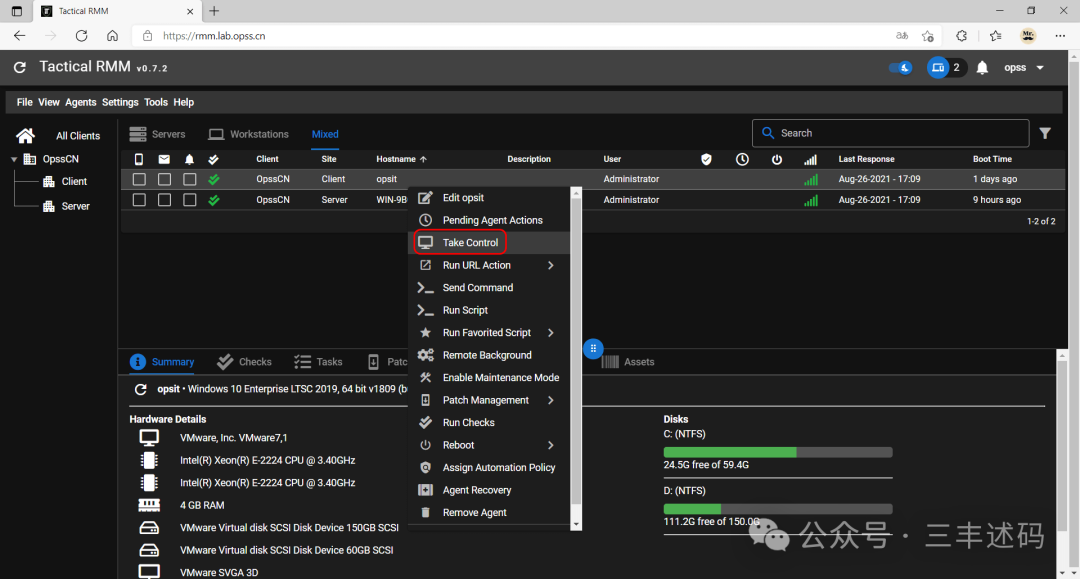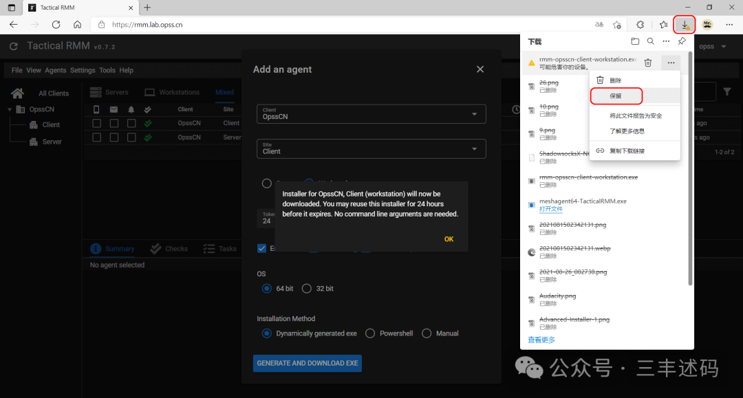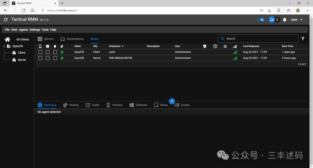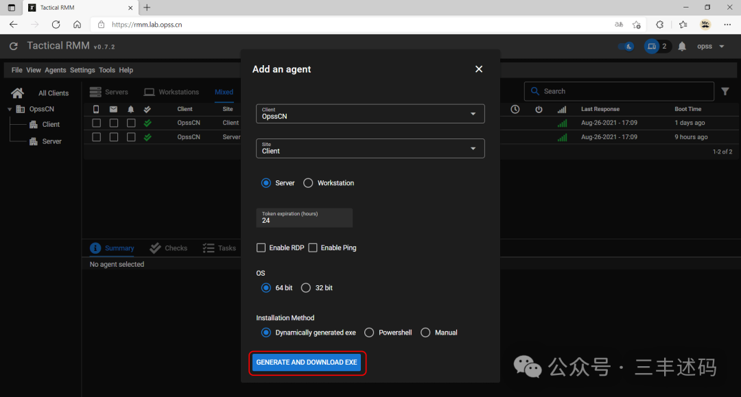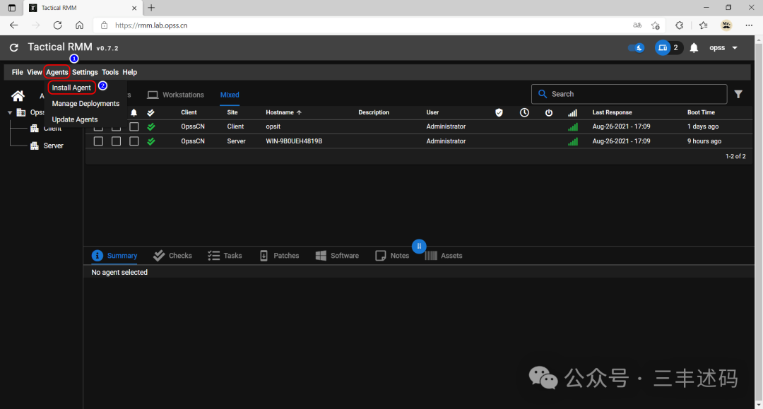 在浏览器输入 rmm.lab.opss.cn 登录系统选择 Agents → Install Agent;