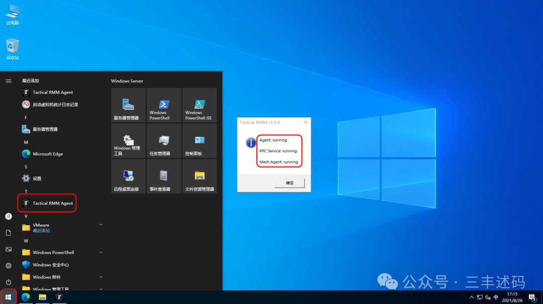代理软件安装完毕在开始菜单会有一个 Tactical RMM Agent 的软件,点击会提示如下图:Agent、RPC Service、Mesh Agent 都显示 Running 说明代理安装成功;