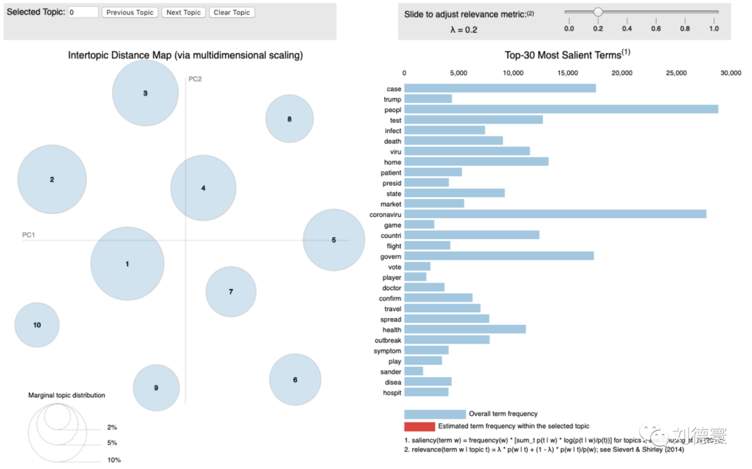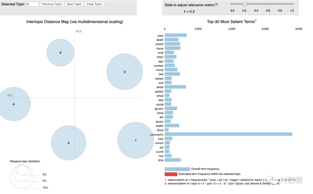 其次,我们构建了LDA主题模型。我们在可视化LDA主题模型时使用了Python里的LDAvis模块[78],对主题特征词排序时,为了提升特征词的解释力还考虑了词频的“相对重要性”——词语在当前主题文章中的出现频率和“绝对重要性”——该词在全文档中出现的频率。相比较而言,本文在平衡两者的权重后,更看重特征词的相对重要性。