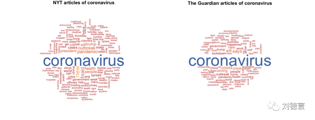 我们首先对《纽约时报》和《卫报》的文章进行了词云统计并进行可视化呈现。本文采用R统计软件中的“wordcloud”包进行词云分析,最低词频数设置为250次。词云是通过词频统计,对文本中出现频率较高的关键词予以可视化呈现,频率越高的词显示地越大,同时由中心向四周扩散。“coronavirus”是两个媒体在报道中出现频率最高的词。