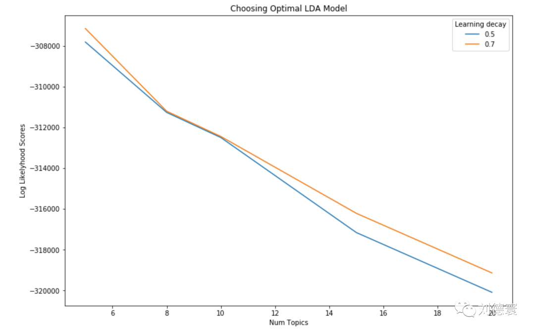 《纽约时报》的最优主题模型是由5个主题数量构成,学习速率为0.7,这个模型的对数似然值为-.12,模型困惑度(perplexity)为508.20。