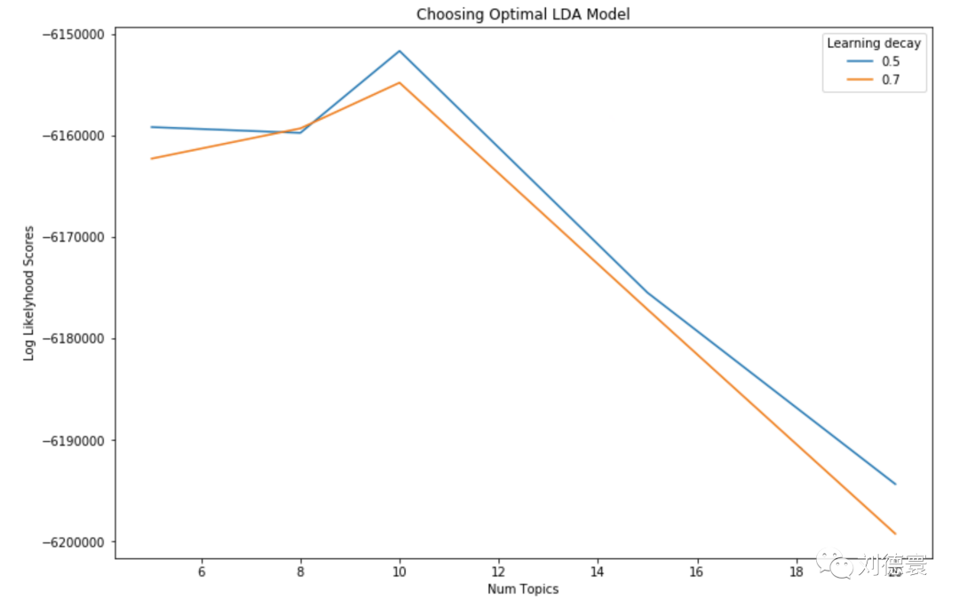 《卫报》的最优主题模型由10个主题数量构成,学习速率为0.5,这个模型的对数似然值为-.48,模型困惑度(perplexity)为1286.11。