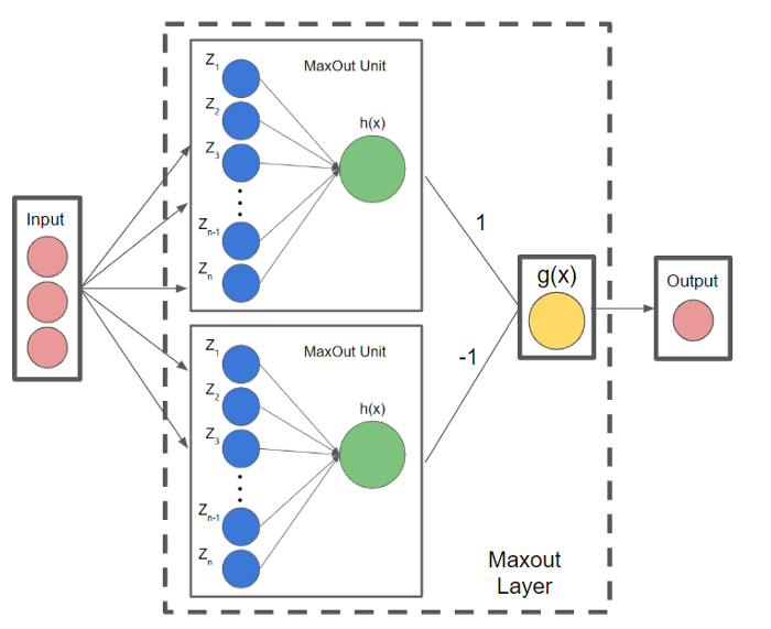 在 Maxout 层,激活函数是输入的最大值,因此只有 2 个 maxout 节点的多层感知机就可以拟合任意的凸函数。