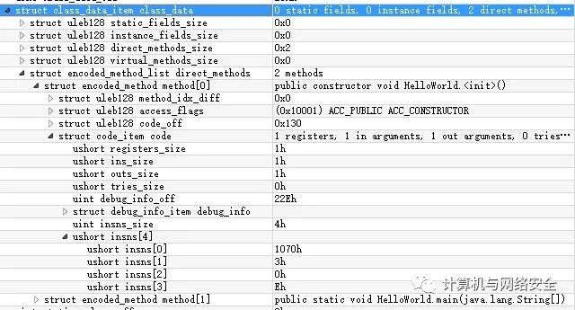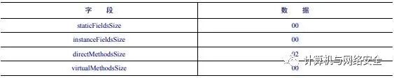 struct DexClassDataHeader { u4 staticFieldsSize; u4 instanceFieldsSize; u4 directMethodsSize; u4 virtualMethodsSize;};