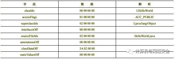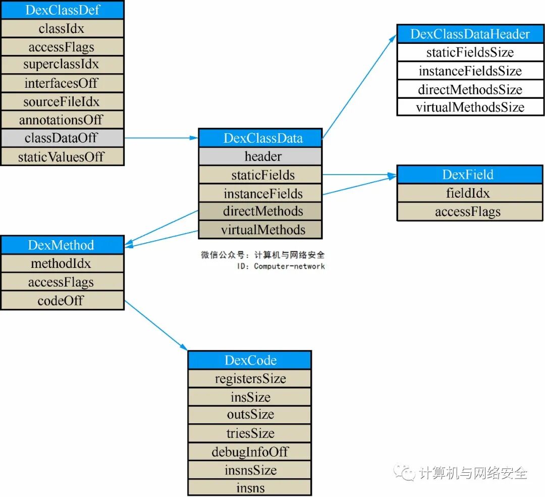 struct DexClassDef { u4 classIdx; u4 accessFlags; u4 superclassIdx; u4 interfacesOff; u4 sourceFileIdx; u4 annotationsOff; u4 classDataOff; u4 staticValuesOff;};