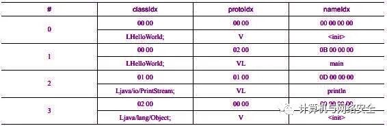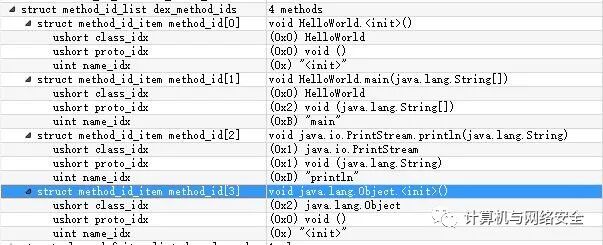 struct DexMethodId { u2 classIdx; u2 protoIdx; u4 nameIdx;};