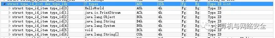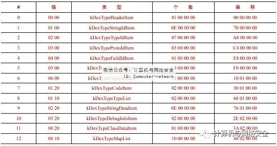 enum { kDexTypeHeaderItem = 0x0000, kDexTypeStringIdItem = 0x0001, kDexTypeTypeIdItem = 0x0002, kDexTypeProtoIdItem = 0x0003, kDexTypeFieldIdItem = 0x0004, kDexTypeMethodIdItem = 0x0005, kDexTypeClassDefItem = 0x0006, kDexTypeMapList = 0x1000, kDexTypeTypeList = 0x1001, kDexTypeAnnotationSetRefList = 0x1002, kDexTypeAnnotationSetItem = 0x1003, kDexTypeClassDataItem = 0x2000, kDexTypeCodeItem = 0x2001, kDexTypeStringDataItem = 0x2002, kDexTypeDebugInfoItem = 0x2003, kDexTypeAnnotationItem = 0x2004, kDexTypeEncodedArrayItem = 0x2005, kDexTypeAnnotationsDirectoryItem = 0x2006,};