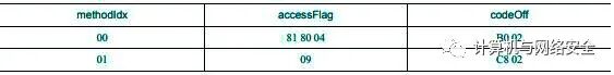 struct DexMethod { u4 methodIdx; u4 accessFlags; u4 codeOff;};