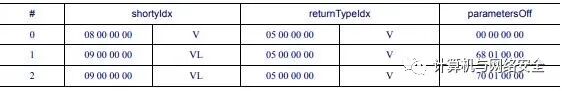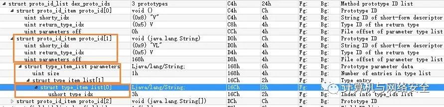 struct DexProtoId { u4 shortyIdx; u4 returnTypeIdx; u4 parametersOff;};