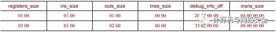 struct DexCode { u2 registersSize; u2 insSize; u2 outsSize; u2 triesSize; u4 debugInfoOff; u4 insnsSize; u2 insns[1]; /
