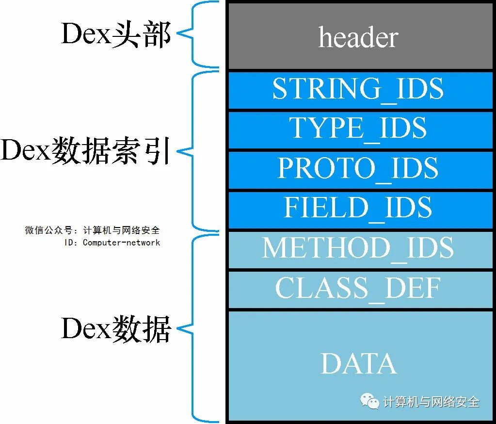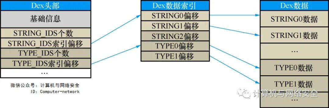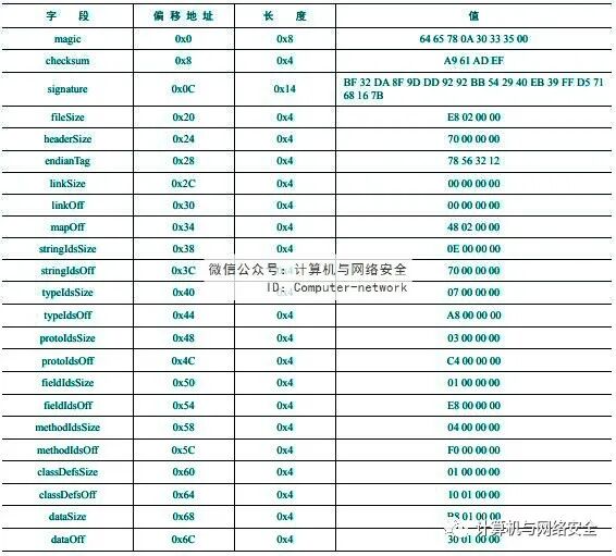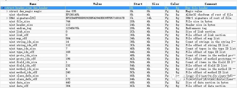 struct DexHeader { u1 magic[8]; u4 checksum; u1 signature[kSHA1DigestLen]; u4 fileSize; u4 headerSize; u4 endianTag; u4 linkSize; u4 linkOff; u4 mapOff; u4 stringIdsSize; u4 stringIdsOff; u4 typeIdsSize; u4 typeIdsOff; u4 protoIdsSize; u4 protoIdsOff; u4 fieldIdsSize; u4 fieldIdsOff; u4 methodIdsSize; u4 methodIdsOff; u4 classDefsSize; u4 classDefsOff; u4 dataSize; u4 dataOff;};