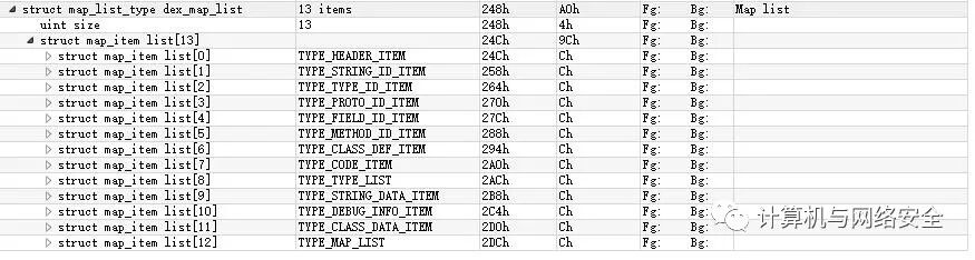 struct DexMapItem { u2 type; u2 unused; u4 size; u4 offset;};