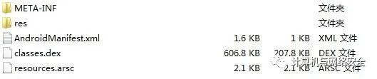 APK文件是一个打包过的文件,其中包含了安卓程序运行所需要的配置文件、资源文件和Dex可执行文件等。看到这里,大家可以从网上下载一个APK文件,或者通过安卓的集成开发环境编译生成一个APK文件。将得到的APK文件的扩展名由.APK修改为.RAR(或者.ZIP也可以),这样就可通过解压缩工具(比如WinRar)打开,打开该.RAR文件后可以看到APK中打包的相关文件,如图1所示。