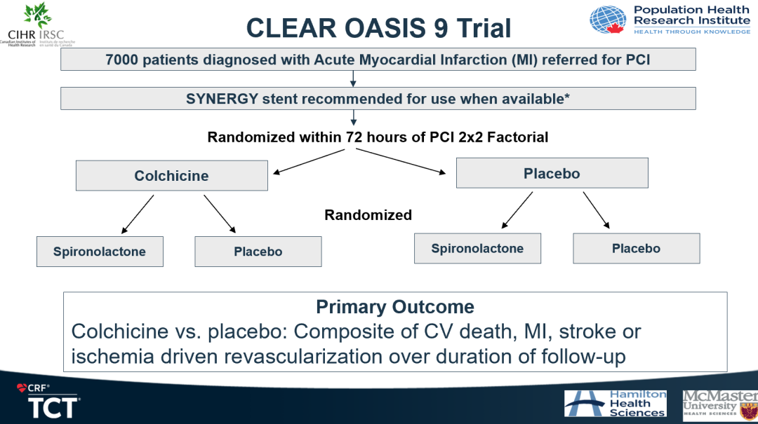 炎症可能在急性冠状动脉综合征和冠状动脉疾病中扮演重要角色。秋水仙碱是一种可减轻炎症的口服药物,一些较小的研究表明它对心血管病人有潜在的益处。CLEAR SYNERGY(OASIS 9)采用安慰剂对照因子设计,是针对急性MI患者的最大的秋水仙碱试验。旨在为急性MI患者常规服用秋水仙碱对临床重要结果的影响提供可靠的证据。