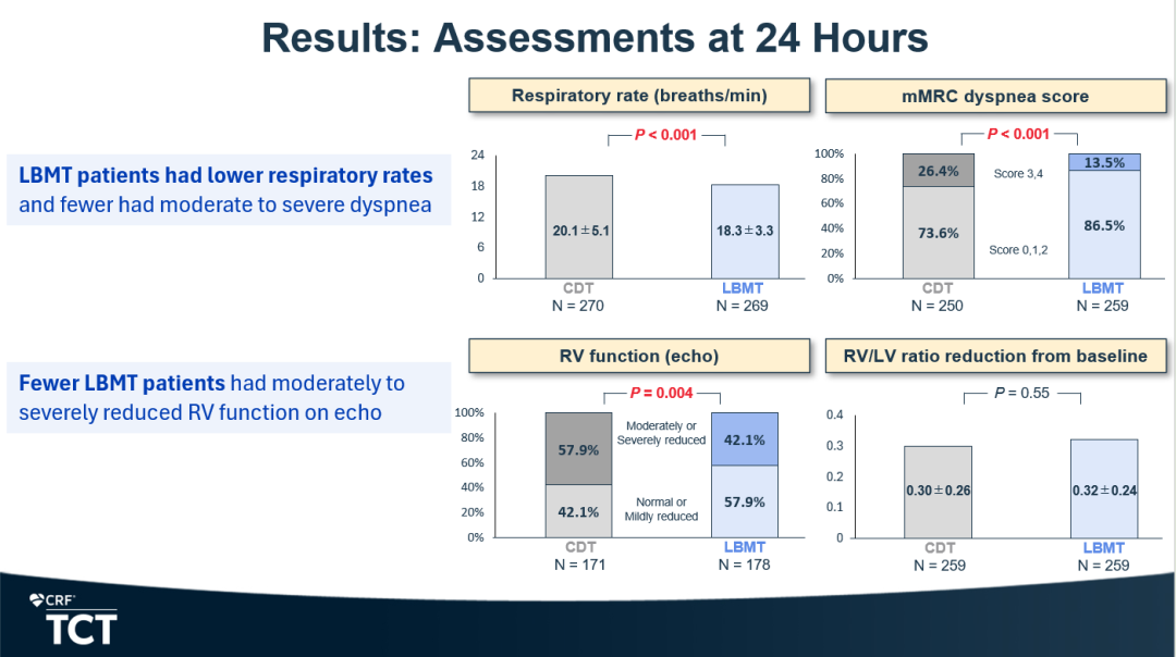 主要终点是以下各项指标的分层获胜比(WR):1)全因死亡率,2)颅内出血,3)大出血,4)临床恶化和/或升级为抢救,5)术后入住重症监护室(ICU)和住院时间。24小时随访时的评估包括呼吸频率、mMRC呼吸困难评分、NYHA分级、右心室(RV)/左心室(LV)比值降低和右心室功能。30天内的终点包括总住院时间、全因再入院和全因死亡率。