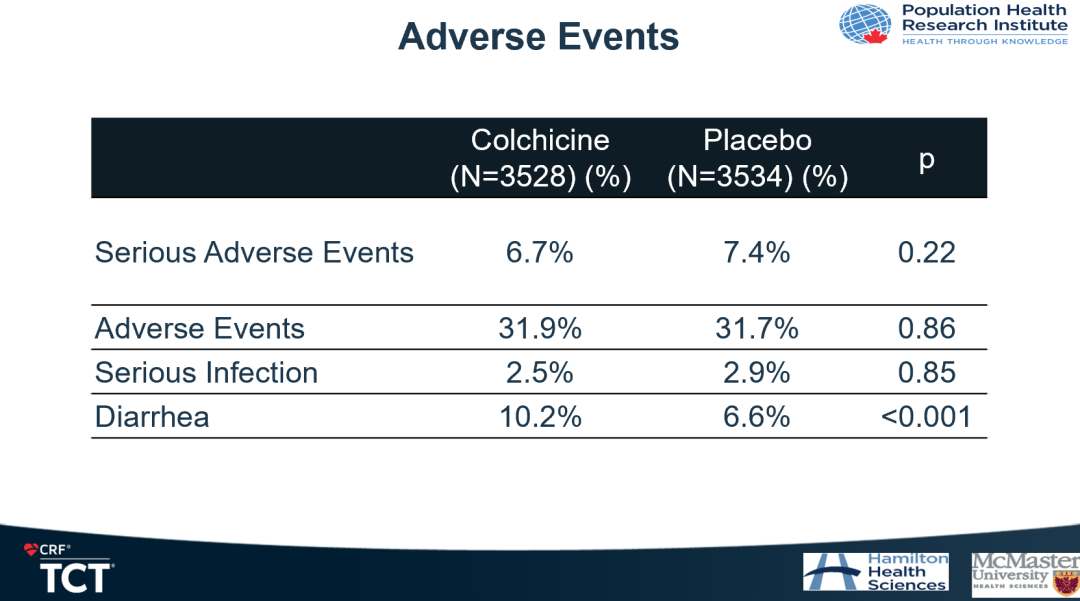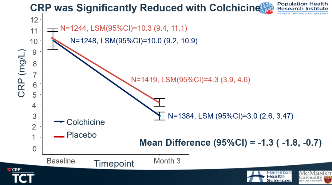 此外,复合终点的各个组成部分均无明显差异。不过,秋水仙碱治疗后,炎症标志物C反应蛋白(CRP)明显降低。