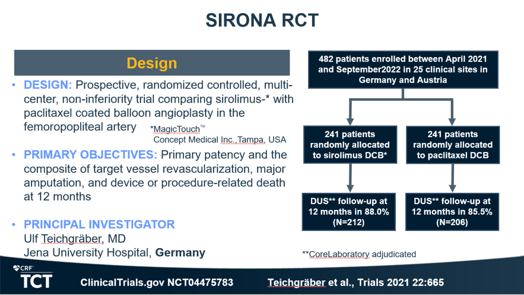 SIRONA研究是一项由研究者发起的前瞻性、随机对照、多中心、非劣效性试验,旨在确定西罗莫司涂层球囊血管成形术是否不劣于紫杉醇涂层球囊血管形成术。2021年4月至2022年9月,在德国和奥地利的25个临床地点共招募482例Rutherford分级2-4级股腘动脉疾病患者,以1:1的比例随机分配接受西罗莫司涂层球囊或紫杉醇涂层球囊的血管成形术。主要有效性终点是12个月时的主要通畅率,主要安全性终点是由靶血管血运重建(TVR)、靶肢体大截肢手术和装备或手术相关死亡组成的复合终点(图1)。