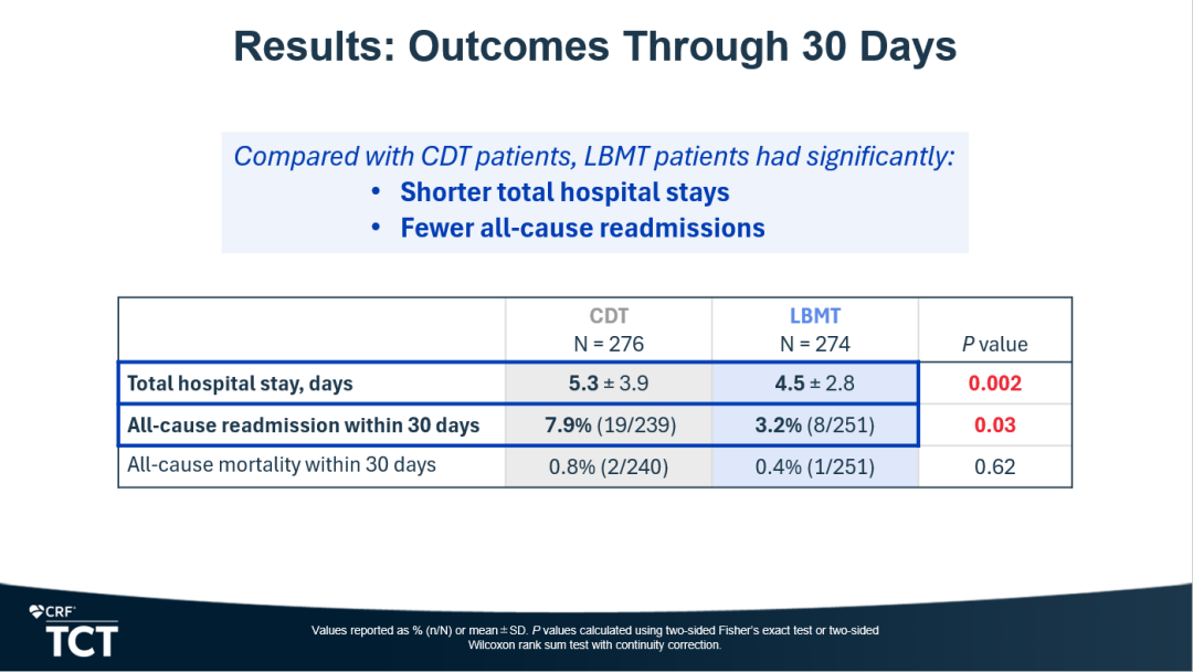 此外,30天结果显示,LBMT患者的总住院时间较短(4.5±2.8 vs. 5.3±3.9夜;P=0.002),全因再入院率较低(3.2% vs. 7.9%;P=0.03),而30天死亡率相似(0.4% vs. 0.8%;P=0.62,图4)。