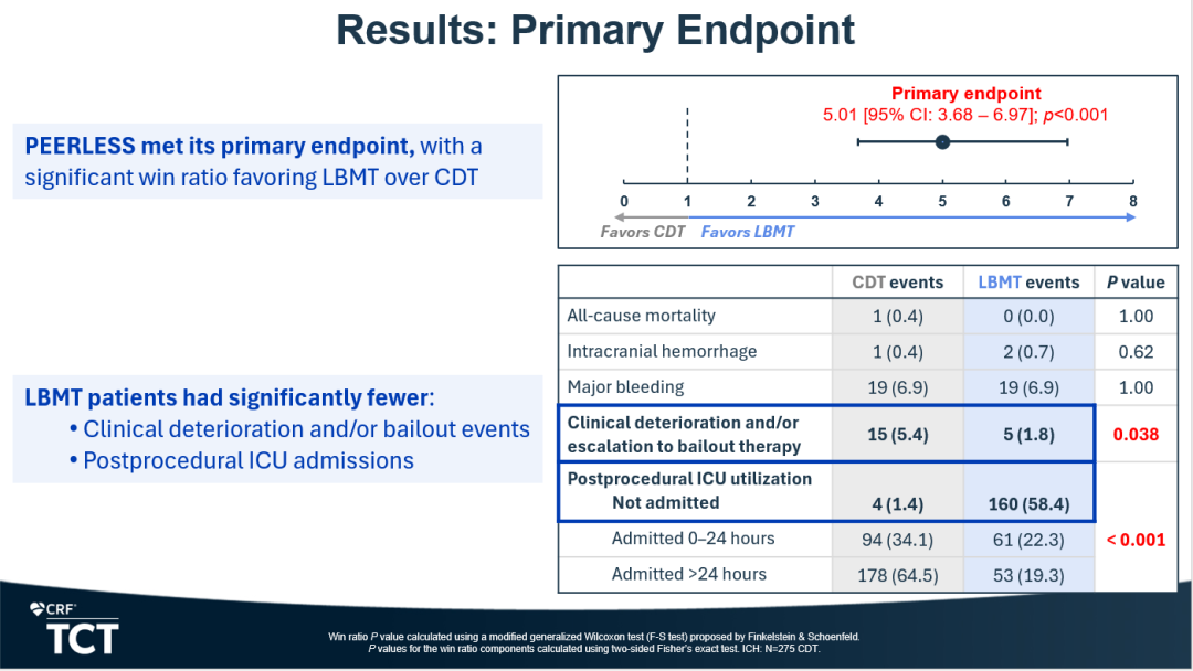 PEERLESS研究达到了其主要终点,证实在中危PE治疗中,LBMT优于CDT治疗。与CDT相比,LBMT的临床恶化和/或抢救率以及术后ICU利用率较低,死亡率或出血风险未见差异。