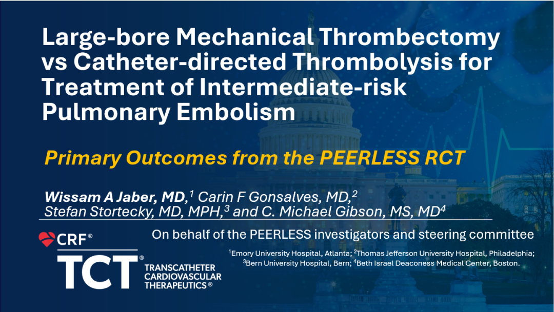 2024年10月27-30日,第36届经导管心血管治疗年会(TCT 2024)在美国华盛顿隆重举行。在大会次日举行的LBCT II:Lancet联合专场上,来自美国埃默里大学医院的Wissam A. Jaber教授公布了随机对照试验PEERLESS研究的主要结果,该研究是首项比较大口径机械血栓切除术(LBMT)和经导管直接溶栓(CDT)的国际随机对照试验(RCT),证实LBMT在全因死亡率、颅内出血、大出血、临床恶化和/或升级到抢救治疗、术后入住重症监护室(ICU)和住院时间等分级检验的汇总结果方面具有优势。该研究结果同布发表在《循环》(Circulation)杂志上。