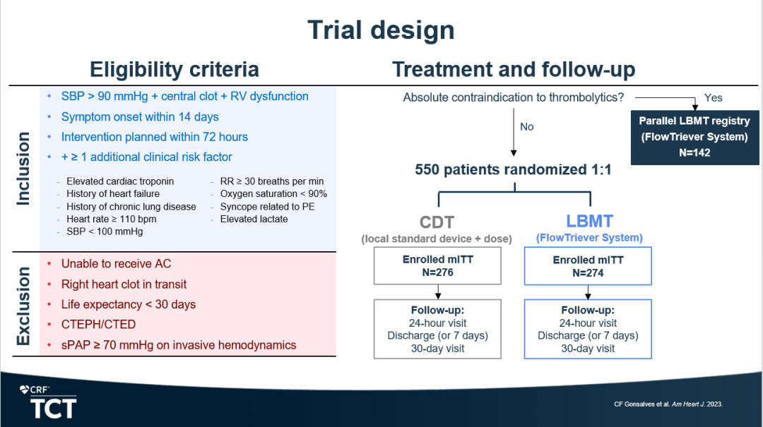 PEERLESS研究(ClinicalTrials.gov标识符:NCT0)是一项前瞻性、多中心RCT。纳入550例血流动力学稳定、右室(RV)扩张且有其他临床危险因素的中危PE患者,1:1随机分组接受大口径机械血栓切除术(LBMT)或经导管直接溶栓(CDT)治疗(图1)。