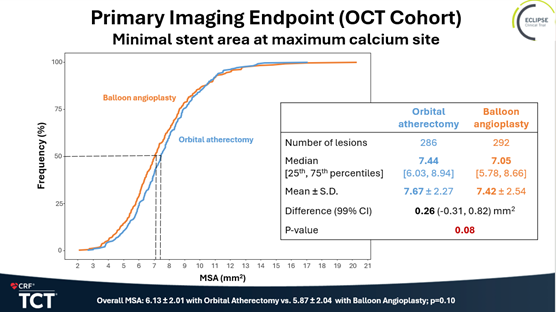 主要影像学终点为术后PCI期间,在预设的美国39个中心中招募的555例患者中,光学相干断层扫描(OCT)评估的最大钙化部位的最小支架面积。结果显示两组的支架面积差异不显著(轨道斑块旋切术组为7.67±2.27 mm²,球囊扩张术组为7.42±2.54 mm²,99%置信区间 0.26 [-0.31, 0.82 mm²],P=0.08)(图3)。