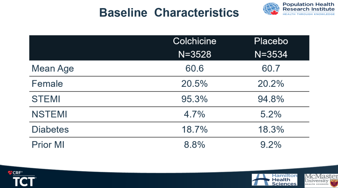 2018年2月至2022年11月期间,共有7062例参与者在14个国家的104个地点接受了随机试验。ST段抬高型心肌梗死(STEMI)或大面积非ST段抬高型心肌梗死(NSTEMI)患者均符合条件。研究对象在经皮冠状动脉介入治疗(PCI)术后72小时内随机接受秋水仙碱或安慰剂治疗。然后,两组患者再次随机接受螺内酯或安慰剂治疗。所有参与者、研究者、医疗服务提供者、数据收集者和结果裁定者对治疗分配均为盲法。