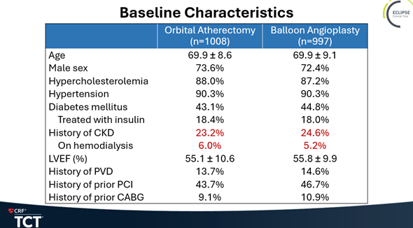 患者在成功穿刺导丝后被随机分配至轨道斑块旋切术策略组(n=1008)或传统球囊扩张术组(n=997),然后接受第二代药物洗脱支架的植入和优化。两组的手术并发症大致相同。