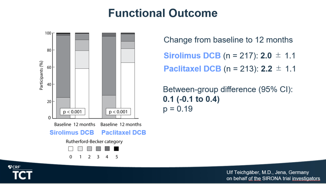 西罗莫司DCB组在12个月时的主要有效性终点主要通畅率为73.8%,而紫杉醇DCB组为75.0%(组间差异:-1.2%,非劣效性P=0.022,图4)。西罗莫司DCB组12个月时主要安全性终点(临床驱动的靶血管血运重建[cdTVR]、大截肢手术或死亡)的发生率为9.4%,紫杉醇DCB组为7.3%(组间差异:2.1%,非劣效性P=0.003,图5)。两组的功能结果相似(图6),无临床驱动的靶病变血运重建(cdTLR)结果相似。