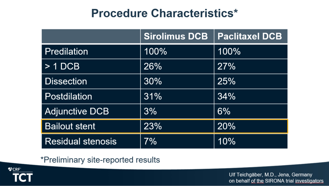 两组患者特征相似,大部分均为Rutherford分级3级(西罗莫司DCB组73%,紫杉醇DCB组69%)。如图2所示,整体上,患者平均病变长度为84±61 mm。根据PACSS(外周动脉钙评分系统)分级,共有34%的病变完全闭塞,29%钙化。在西罗莫司DCB组和紫杉醇DCB组的病变中,分别有22.8%和20.3%植入了挽救性支架(差异:2.5%,图3)。