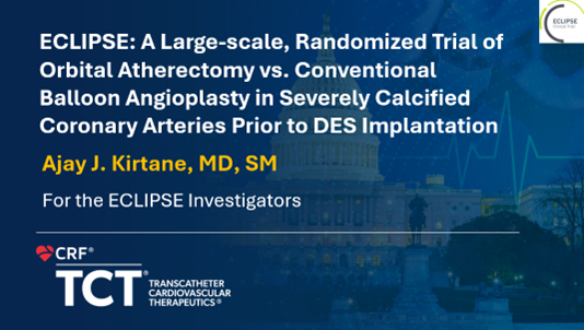 2024年10月27-30日,第36届经导管心血管治疗年会(TCT 2024)在美国华盛顿隆重举行。在大会次日举行的LBCT Ⅱ:Lancet联合专场上,纽约长老会医院/哥伦比亚大学欧文医学中心心脏病科Ajay J. Kirtane n博士代表ECLIPSE研究团队公布了严重钙化病变药物洗脱支架(DES)植入前行冠状动脉轨道斑块旋切术与传统球囊血管成形术的大规模随机试验(ECLIPSE研究)的结果。该结果显示,在严重钙化的冠状动脉中,常规使用轨道斑块旋切术进行病变预处理,与传统的球囊扩张术相比,结果相似,未显示出优势。