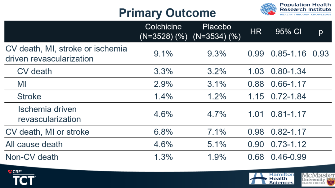在中位随访三年时,心血管死亡、复发性MI、卒中或缺血导致的血运重建的复合死亡率在秋水仙碱组和安慰剂组之间没有显著差异(9.1% vs. 9.3%,HR 0.99,95%CI [0.85-1.16],P=0.93)。